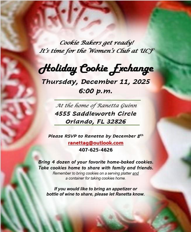 Cookie Bakers get ready! It’s time for the Women’s Club at UCF Holiday Cookie Exchange Thursday, December 11, 2025 from 6-8 pm at the home of Ranetta Guinn, 4555 Saddleworth Circle in Orlando. Please RSVP to Ranetta by December 8th by email to ranettag@outlook.com or text 407-625-4626. Please bring 4 dozen of your favorite home-baked cookies. Take cookies home to share with family and friends. Remember to bring cookies on a serving platter and a container for taking cookies home. If you would like to bring an appetizer or bottle of wine to share, please let Ranetta know.