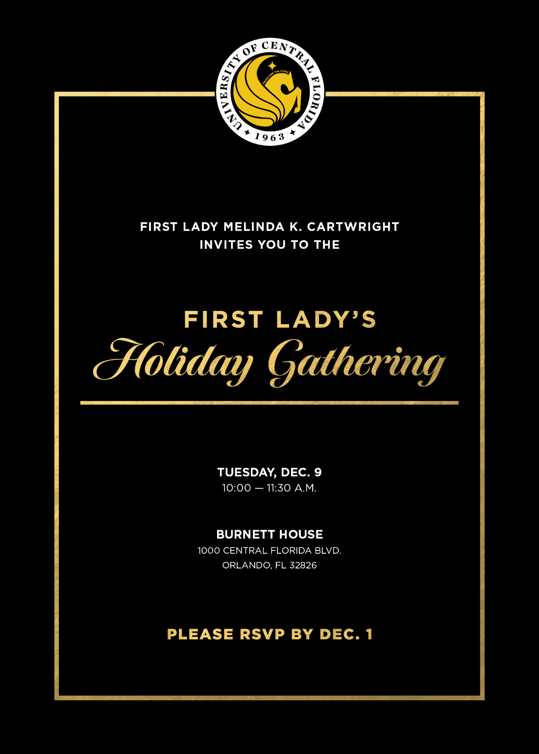 On behalf of Melinda K. Cartwright, all Women’s Club at UCF members are invited to the First Lady’s Holiday Gathering at the Burnett House on Tuesday, December 9, from 10:00 to 11:30 a.m. This cherished annual tradition brings together members of the UCF community and friends whose generosity and leadership strengthen the university’s mission. The gathering offers a warm and festive opportunity to connect and celebrate the season with those who make UCF such a special place. Light refreshments, coffee, and tea will be served. Donations to Knights Pantry will be accepted to support UCF students in need. Please RSVP online by Monday, December 1. Festive holiday attire is encouraged.